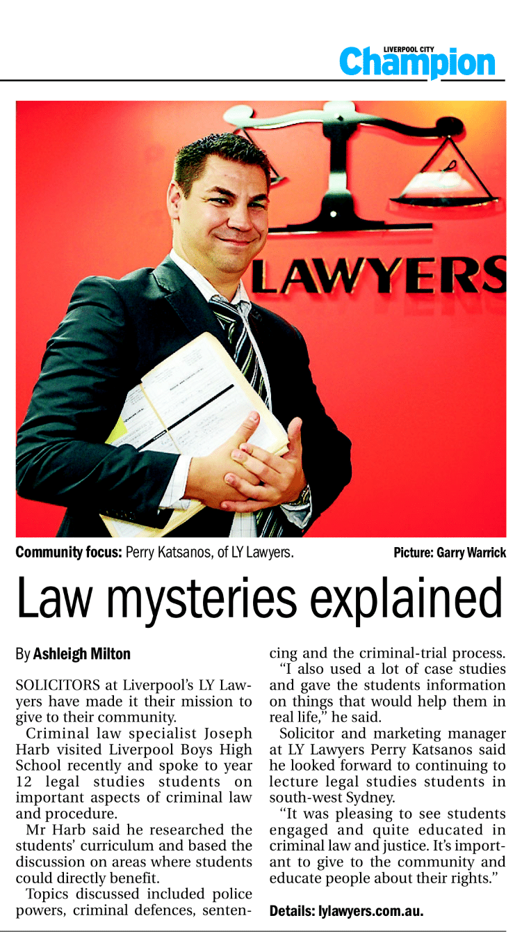 This week, Perry Katsanos and Joseph Harb, both solicitors at our office, appeared in the Liverpool Champion newspaper. Perry and Joseph regularly attend local High Schools in Sydney’s South West and Sydney’s West lecturing Legal Studies students on various aspects of Criminal Law Practice and Procedure.